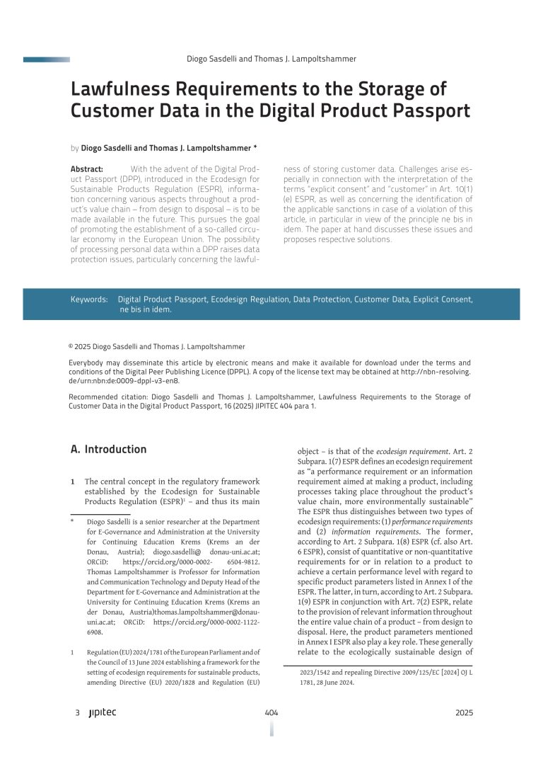With the advent of the Digital Product Passport (DPP), introduced in the Ecodesign for Sustainable Products Regulation (ESPR), information concerning various aspects throughout a product’s value chain – from design to disposal – is to be made available in the future. This pursues the goal of promoting the establishment of a so-called circular economy in the European Union. The possibility of processing personal data within a DPP raises data protection issues, particularly concerning the lawfulness of storing customer data. Challenges arise especially in connection with the interpretation of the terms “explicit consent” and “customer” in Art. 10(1)(e) ESPR, as well as concerning the identification of the applicable sanctions in case of a violation of this article, in particular in view of the principle ne bis in idem. The paper at hand discusses these issues and proposes respective solutions.